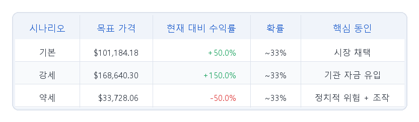 시나리오 기반 목표가 (각 33% 확률 균등 배분): * 🐂 강세 시나리오 (+150.0%): $168,640.30 — 광범위한 기관 채택과 거시 유동성 순풍 발생 시. * ⚖️ 기본 시나리오 (+50.0%): $101,184.18 — 2026년 4월 5일 기준 현재가($67,456.12) 대비 타겟. * 🐻 약세 시나리오 (-50.0%): $33,728.06 — (1) 거래소 순유입 7일간 10억 달러 초과 및 국가 주도 시장 조작 긴장 고조, 또는 (2) 미국 실질 수익률 2.5% 초과 시 트리거.