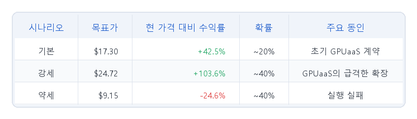 | 시나리오 | 목표가 | 현재 대비 수익률 | 확률 | 핵심 동인 | |---|---|---|---|---| | 기본 | $17.30 | +42.5% | ~20% | 초기 GPUaaS 계약 | | 강세 | $24.72 | +103.6% | ~40% | 빠른 GPUaaS 확장 | | 약세 | $9.15 | -24.6% | ~40% | 실행 실패 |