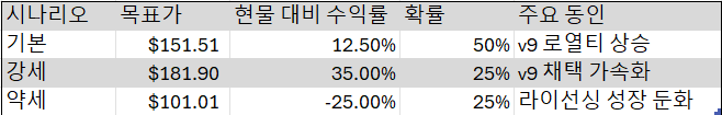 강세 시나리오 목표가 181.90 달러는 고로열티 v9 설계의 채택 가속화에 따라 상당한 +35.0%의 상승 여력을 제시합니다.