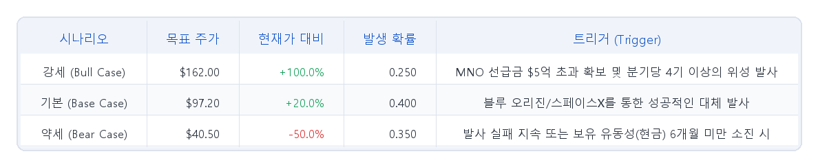 2026년을 향한 당사의 시나리오 기반 주가 분석은 세 가지 경로로 나뉩니다. 기본 시나리오(Base Case) 의 목표가는 $97.20로, 현재가 $81.00 대비 20.0%의 상승 여력을 의미합니다. 40%의 확률이 부여된 이 시나리오는 당사 내부 밸류에이션 모델의 1.2배 멀티플을 적용했으며, 스페이스X를 통한 대체 위성의 성공적인 발사로 블루 오리진 실패를 만회하고, 2026년 말까지 초기 상업적 매출을 창출한다는 가정에 기반합니다. 강세 시나리오(Bull Case) 는 25%의 확률로 $162.00의 목표가, 즉 100.0%의 상승을 전망합니다. 여기에는 2.0배의 멀티플이 적용되며, 위성군의 빠른 구축, 미국 및 유럽(EU)에서의 규제 승인 획득, 그리고 재무상태표의 위험을 사실상 제거해 줄 $5억 이상의 MNO 선급금 확보를 전제로 합니다.