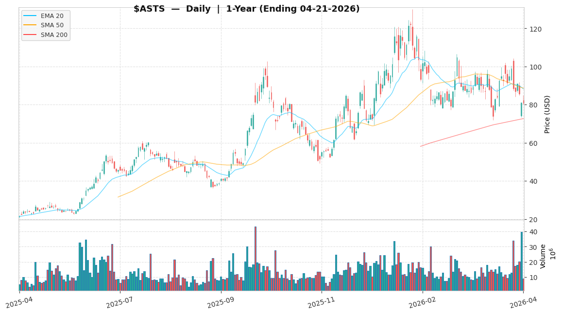 정량적인 관점에서 볼 때, AST 스페이스모바일의 재무 프로필은 고성장, 고위험 우주 기술 기업의 전형적인 모습을 띠고 있습니다. -536.14배의 선행 P/E는 현재 수익과는 완전히 무관하며, 철저하게 2027년 및 2028년의 예상 현금 흐름에서 파생된 가치 평가입니다. 현재 주가 $81.00는 최근 발사 실패를 딛고 성공적으로 회복할 것이라는 기대를 반영하고 있으나, 허용될 수 있는 오류의 마진은 크게 줄어들었습니다. $20.68에서 $129.89에 이르는 52주 변동폭은 이 자산이 가진 높은 베타(Beta, 전체 시장 대비 개별 주식의 변동성 척도)를 여실히 보여줍니다.
