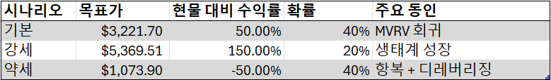 당사의 기본 시나리오 목표가는 3,221.70 달러(+50.0% 상승)입니다. 이는 지속적으로 두 자릿수 수익률을 기록했던 ‘매수 구간’에서의 역사적 MVRV 비율 회귀 데이터를 바탕으로 도출되었습니다. 강세 시나리오 목표가는 5,369.51 달러(+150.0% 상승)로, 광범위한 암호화폐 시장의 유동성 회복 시 달성 가능합니다. 약세 시나리오 목표가는 1,073.90 달러(-50.0% 하락)이며, MVRV 비율이 0.8 미만으로 지속적으로 하락하고 스테이블코인 시가총액이 크게 축소될 경우 현실화될 수 있습니다.