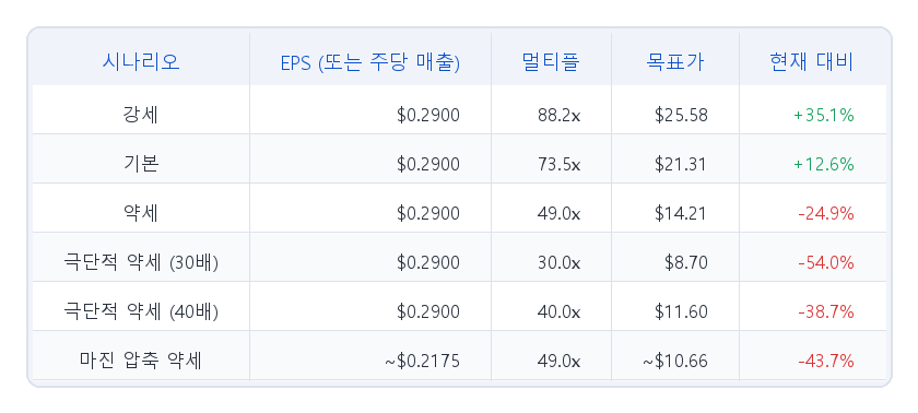 강세 시나리오 목표가: 23.20 달러 — 기존 25.58 달러에서 하향 조정 — 확장된 EPS 추정치에 80.0배를 적용합니다(기존 88.2배에서 하향). 멀티플 상한이 낮아진 것은 강세 시나리오가 이제 단순한 매출 성장이 아니라, AI 네이티브 워크플로우를 플랫폼에 통합하여 대체가 아닌 공존을 입증해야 한다는 더 높은 실행 기준을 요구하기 때문입니다. 현재 수준 대비 +22.6% 상승 여력을 시사합니다.