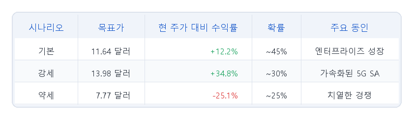 강세 시나리오 — 13.98달러 (+34.8%): 가속화된 5G SA 채택으로 2026년 목표를 초과하는 마진 상승을 가정한 확대 EPS 추정치에 30.4배를 적용합니다. 이 시나리오는 노키아가 레거시 하드웨어 피어가 아닌 소프트웨어 비교 가능 피어 수준으로 격차를 좁히는 것을 전제로 합니다.
