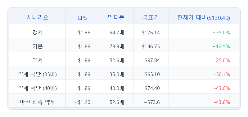 당사의 기본 시나리오 목표가는 146.75달러로, 2026년 4월 9일 기준 FactSet 컨센서스 NTM EPS 1.8600달러에 78.9배를 적용한 것입니다(현재 수준 대비 +12.5%). 70.1배에서 78.9배로의 멀티플 확장은 Rule of 40 점수 ~96, PEG ~2.1배에 의해 뒷받침됩니다 — 역사적 SaaS 프리미엄 범위의 상한이지만, 미국 상업 부문 매출이 재가속할 경우 방어 가능합니다.